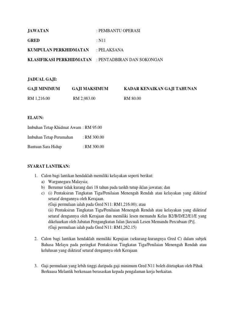 Gaji Kelayakan Tugas Pembantu Operasi Gred N11 Spa