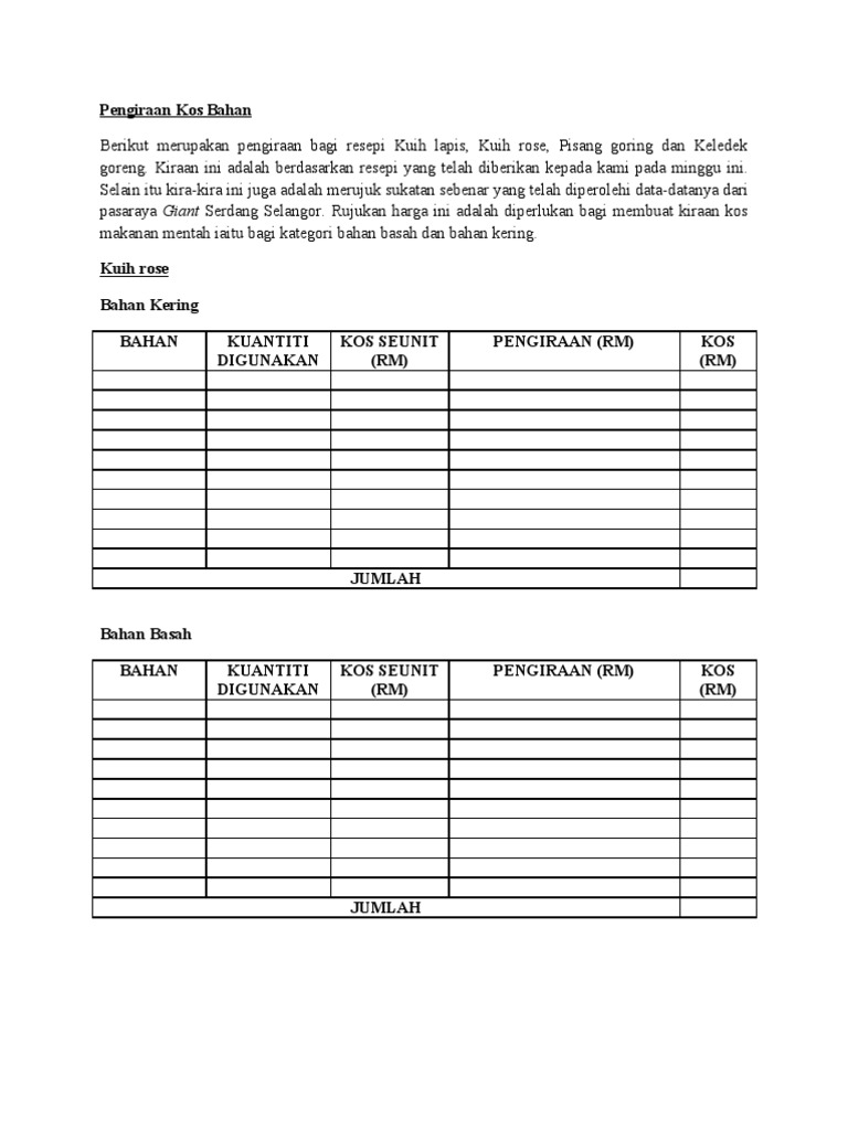 1 Kos Bahan Penyediaan Kek Kaedah Putar